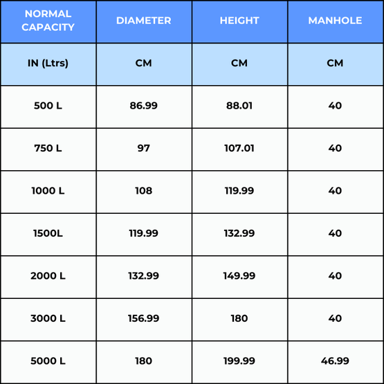 - Capacity: Available in 500, 750, 1000, 1500, 2000, 3000, and 5000 Litres